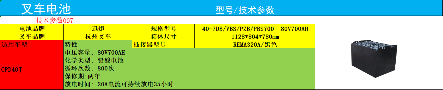 杭州叉车电瓶CPD35 迅炬40-7VBS700 杭叉蓄电池组80V700AH厂家杭州叉车电瓶40-7VBS700是专为3.5吨级CPD35电动叉车定制的重载型动力核心,以80V额定电压与700AH大容量的强劲配置,成为重型工业物流场景的优选方案。这款杭州叉车电瓶由40只2V单体铅酸电池串联而成,通过酸循环化成技术确保电压输出均衡,*匹配CPD35叉车在重载搬运、爬坡作业中的动力需求。在结构设计