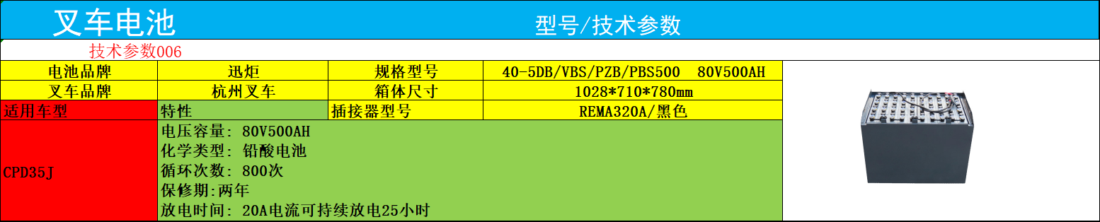杭州叉车电瓶CPD35 迅炬40-5VBS500 杭州3.5吨叉车电瓶80V500AH