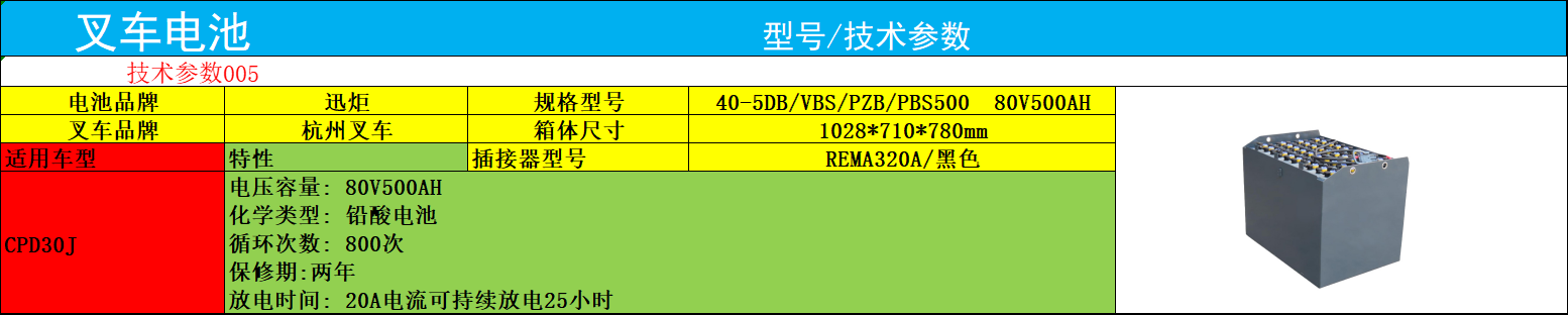 无论是制造业原材料转运,还是大型仓库货物装卸,杭州叉车电瓶40-5VBS500都以稳定性能与适配性,成为CPD30叉车不可或缺的动力核心。