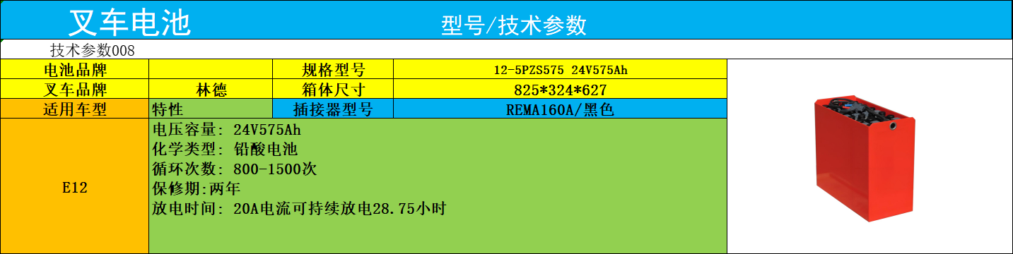 无论是狭窄货架间的货物堆垛,还是生产线旁的原料转运,叉车锂电池12-5PZS575都以适配性强、性能可靠、维护简便的特质,成为林德E12叉车不可或缺的动力核心,*契合现代物流*低耗的运营需求。