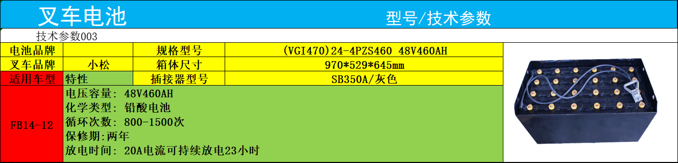 小松叉车专用锂电池VGI470 迅炬48V470AH电动叉车电瓶型号规格作为深耕叉车专用锂电池领域的实力厂家,我们针对小松FB14-12量身定制的电动叉车电瓶型号VGI470,凭借*适配性与硬核性能,成为仓储物流场景的核心动力选择。这款叉车专用锂电池VGI470严格遵循48V470AH的核心规格设计,铁箱尺寸*把控在970X529X645MM,与小松FB14-12的电池安装舱*契合,无需额外