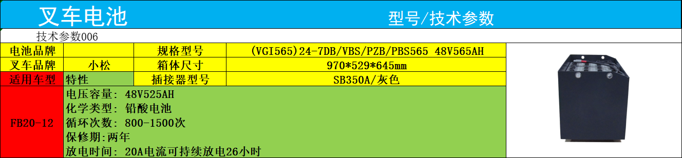 作为深耕工业动力领域的叉车蓄电池代理,我们深知小松叉车对可靠动力的核心需求,针对小松FB20-12叉车研发的24-7VBS565电池,既是适配性极强的小松叉车电瓶,更是符合行业高标准的叉车专用蓄电池。这款叉车专用蓄电池严格遵循48V565AH核心规格设计,铁箱尺寸*控制在970X529X645MM,与小松FB20-12的电池安装舱*契合,无需额外切割或改装即可快速装配——这正是我们叉车蓄电池代理在筛选小松叉车电瓶时的核心考量,确保每一块叉车专用蓄电池都能让小松叉车无需长时间停机,迅速投入仓储搬运、重型货物堆垛作业,切实提升用户的作业效率。