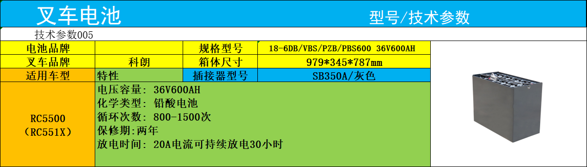 科朗叉车RC5500系列叉车电瓶18-6VBS600 迅炬叉车RC551X电瓶安装参数36V600AH